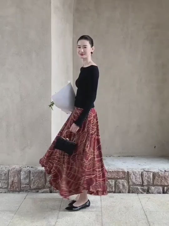 深みのあるレッドを基調に、アンバーの筆描きラインを重ねたプリントが目を引くフレアスカート。ウエストはすっきりと見える切り替えで、歩くたびに揺れるアシンメトリー裾と細かなフリルが立体感をつくります。さらりと落ちる軽やかな生地感で、トップスをインしてもアウトでもバランスよく決まる一枚。黒のニットやシンプルなブラウスに合わせれば、上品で華やかな秋色コーデが完成します。