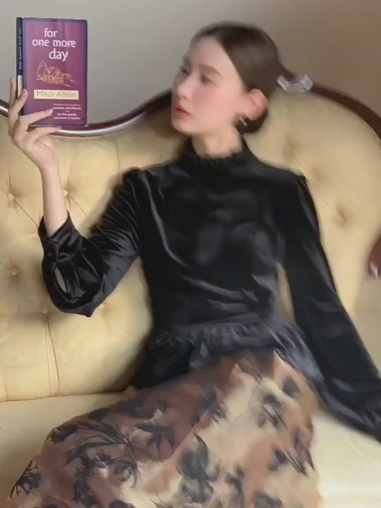 アンティーク調のゴールドに黒のフロッキー花柄を重ねたオーガンザが、歩くたびにやわらかく光るスカート。内側にはなめらかなベルベット調の裏地を使用し、透けを気にせず着用可能です。ハイウエストのAラインは、腰回りをすっきり見せながら足長効果も期待できます。黒ニットやベルベットのトップスと合わせて、結婚式やパーティーなどの特別な日の装いにも、フラットシューズでデイリーなコーデにも活用できるアイテムです。