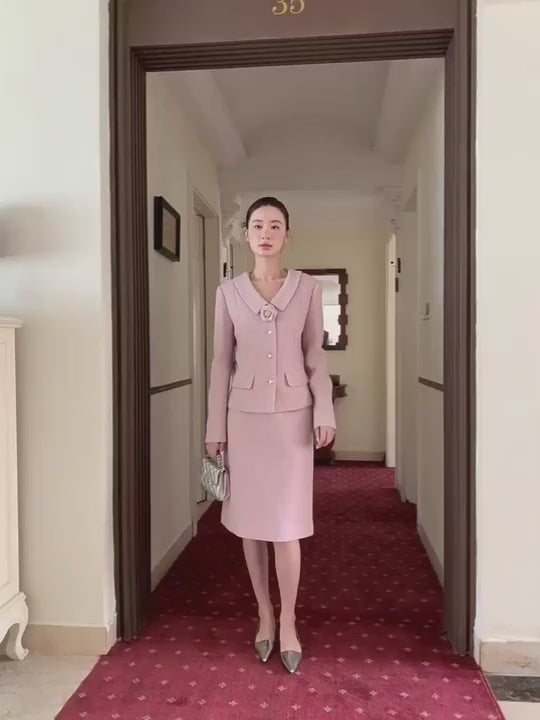 上品なライラックピンクのツイード生地を使用したジャケット&スカートのセットアップ。