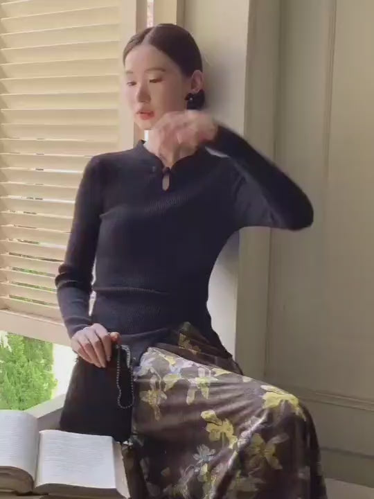 落ち着いたブラウンベースに、柔らかなイエローフラワーが映えるヴィンテージライクなフレアスカート。